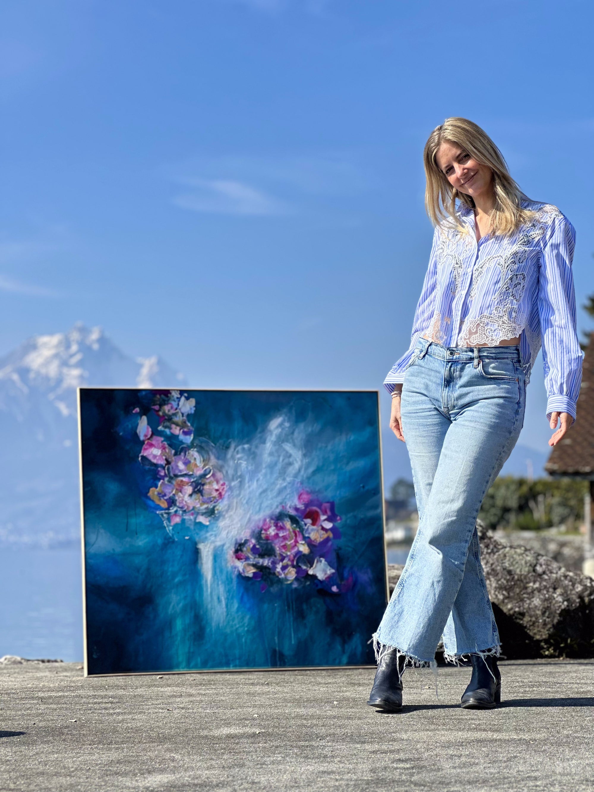 I'm Janine Räker. I live in Weggis on Lake Lucerne, Switzerland — surrounded by water and Alps. I paint with acrylics and mixed media, intuitively, emotionally, without a safety net.